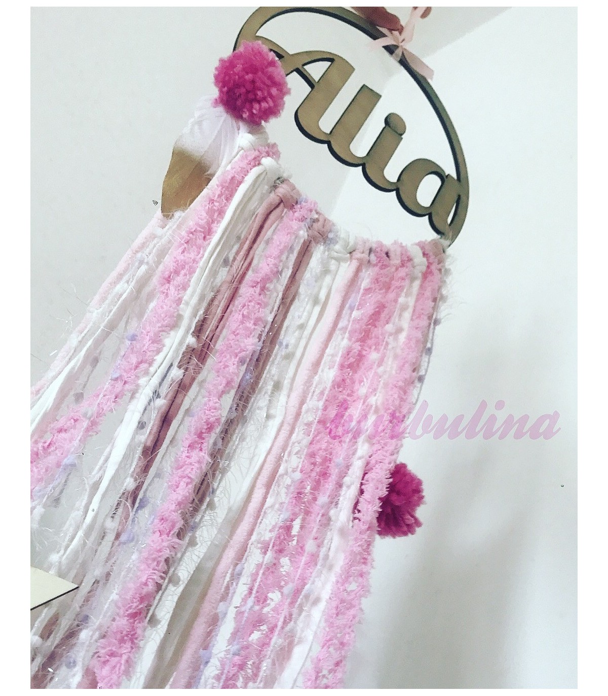 Atrapasueños gigante de madera de 80cm de largo en tonos Rosas y blanco con plumas y corazones de madera. Adornado con tres pompones fuxias de diferentes tamaños.