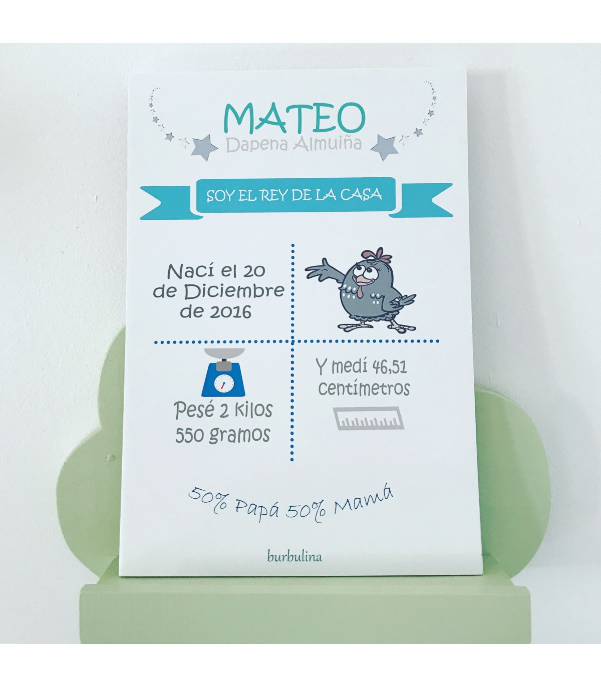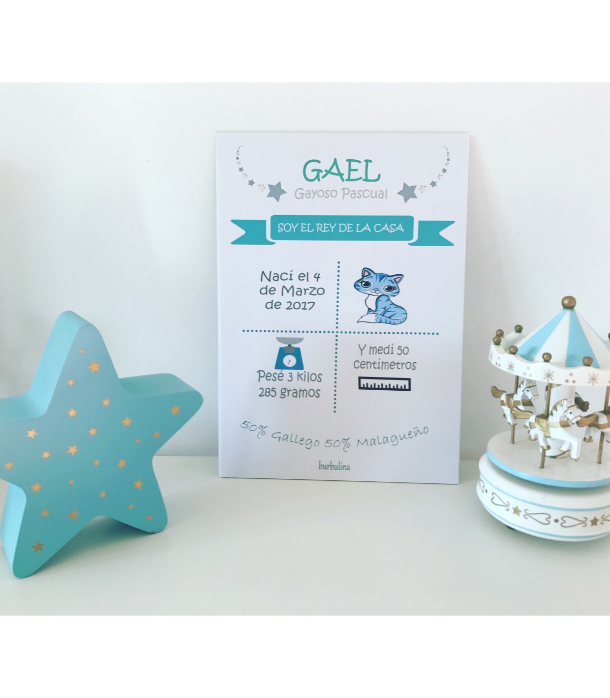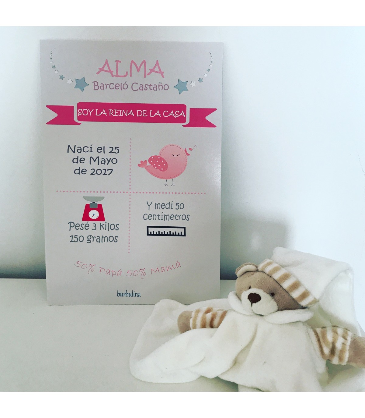 Lámina de nacimiento para enmarcar. Impresa en papel satinado de alta calidad. Tamaño A4. Disponble en tonos rosas, azules y mint