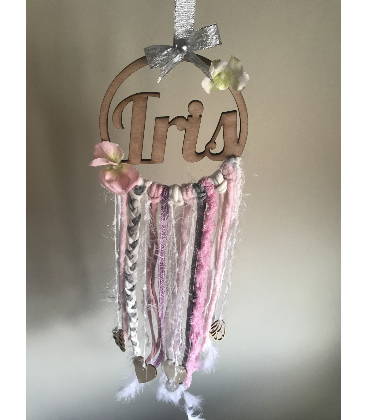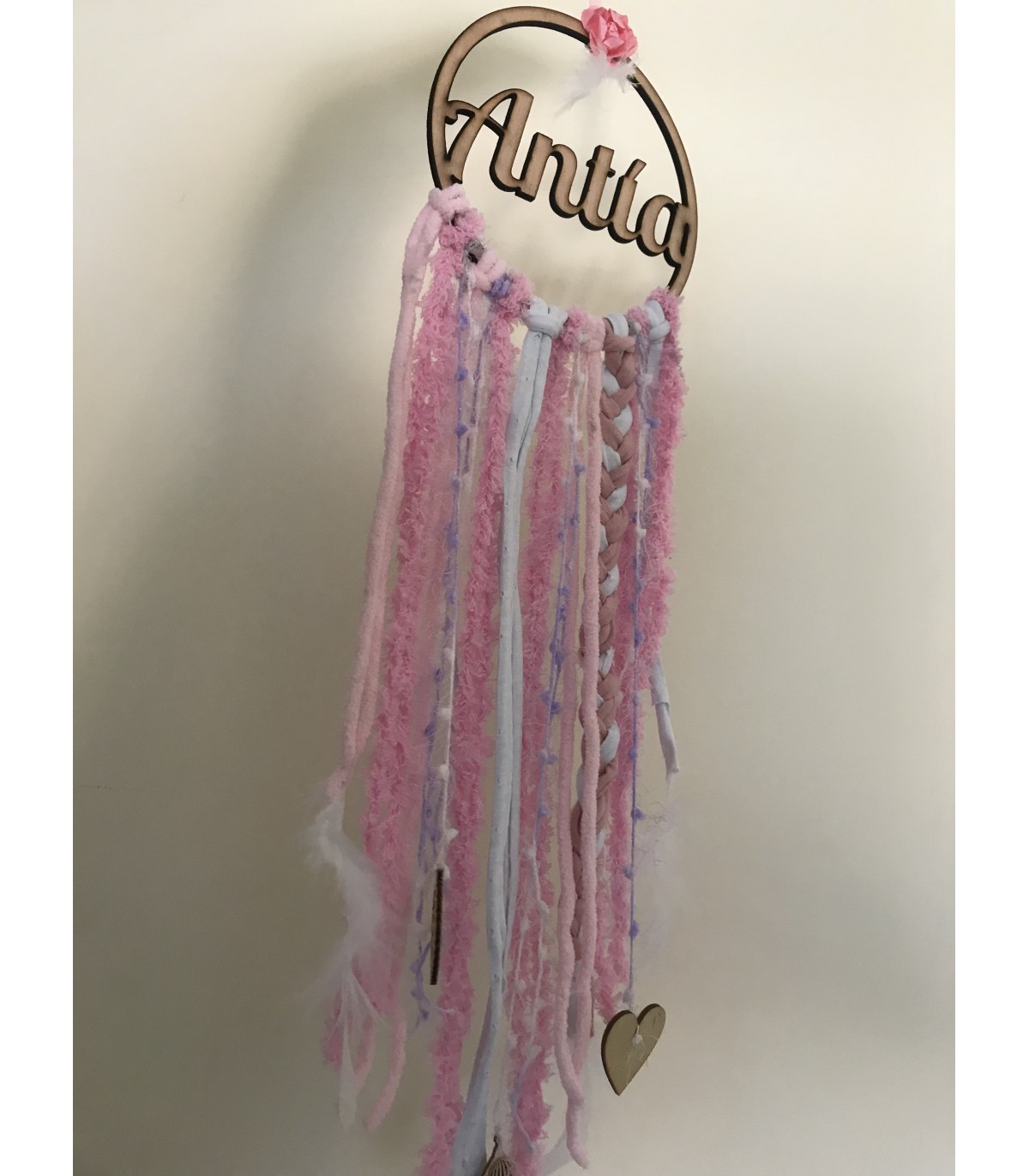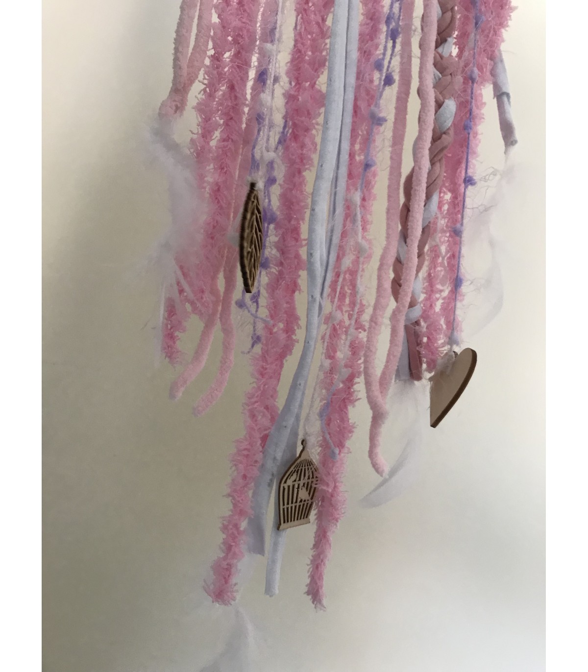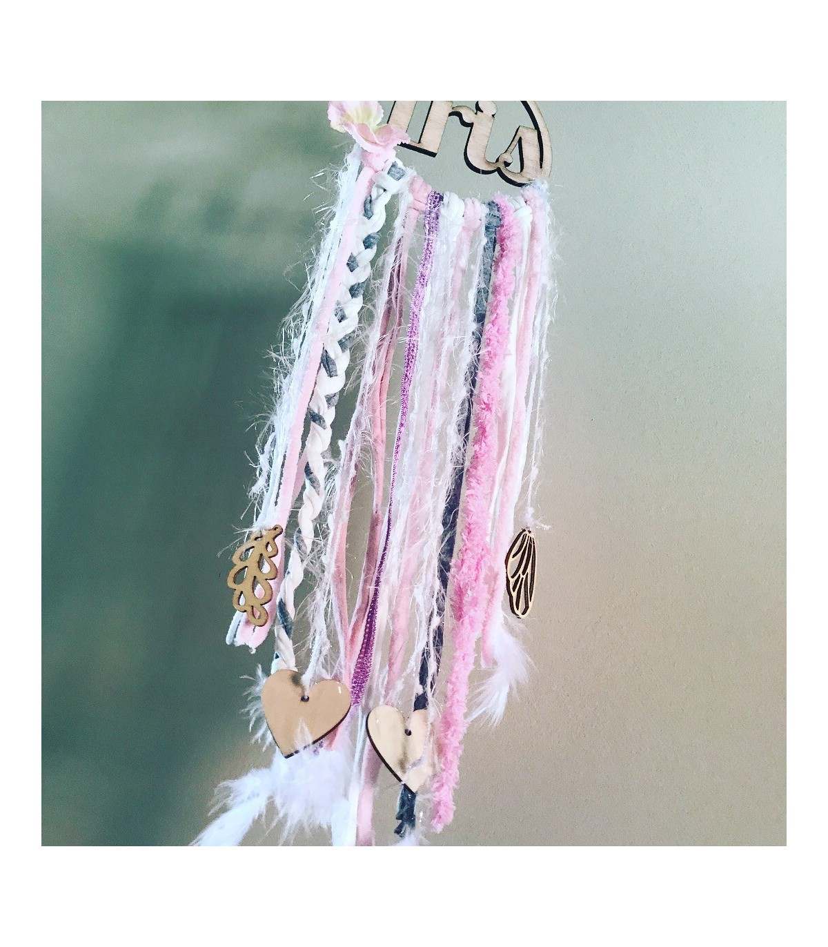 Atrapasueños de madera de 60cm de largo en tonos rosa, gris y blanco , con plumas, flores en el aro y corazones de madera.