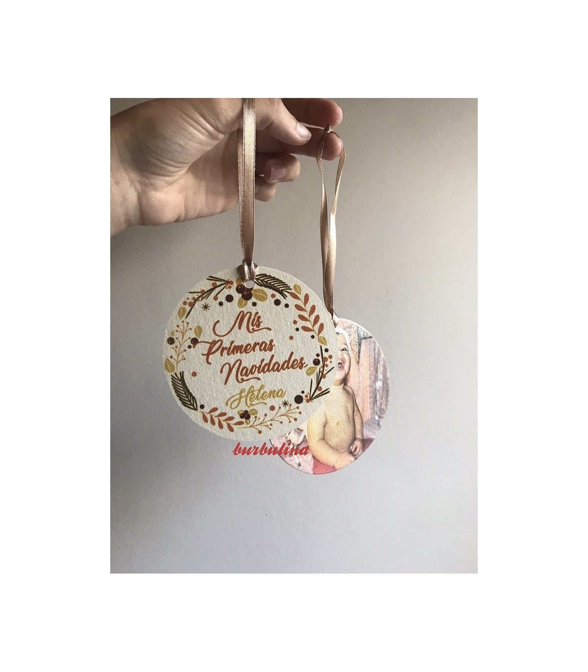 adorno navideño personalizable a dos caras, una de ellas con foto.