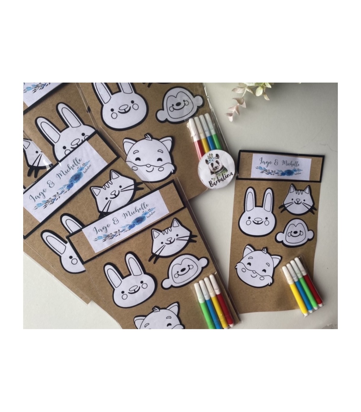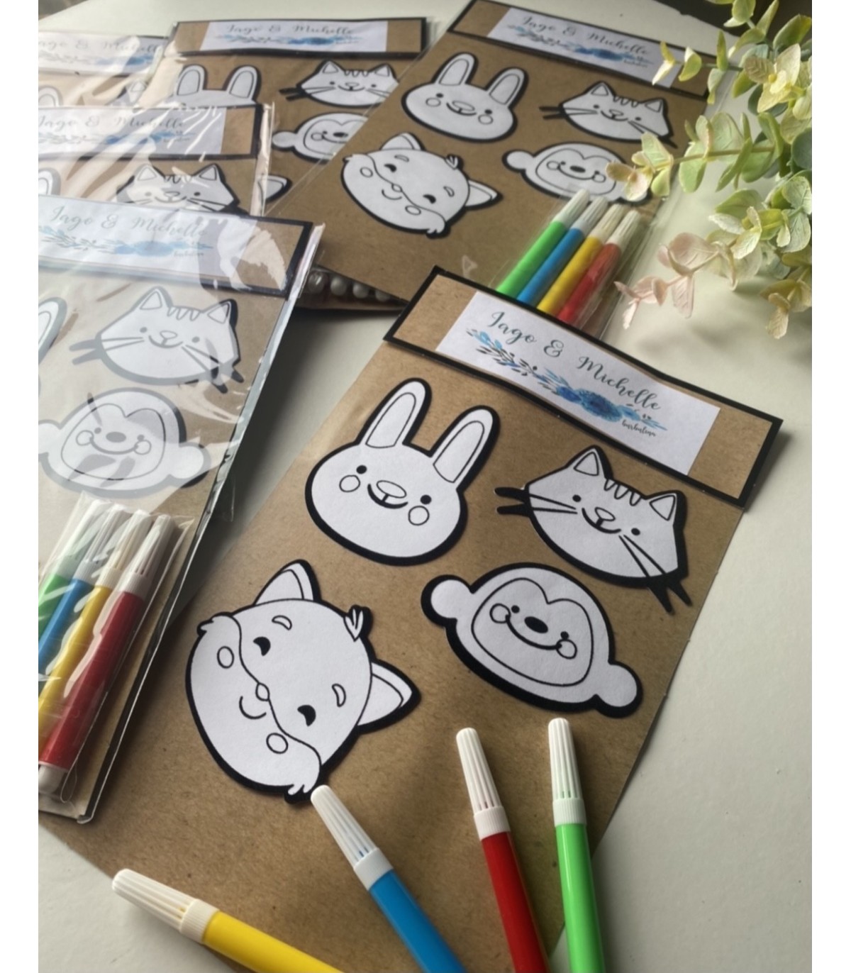 Pegatinas terciopelo coloreables con rotuladores. El paquete va personalizado para el evento que quieras