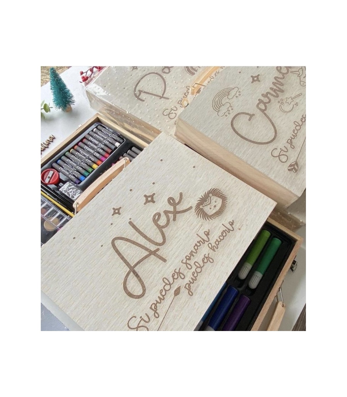 Maletín de madera personalizado modelo león con  de colores, rotuladores y acuarelas