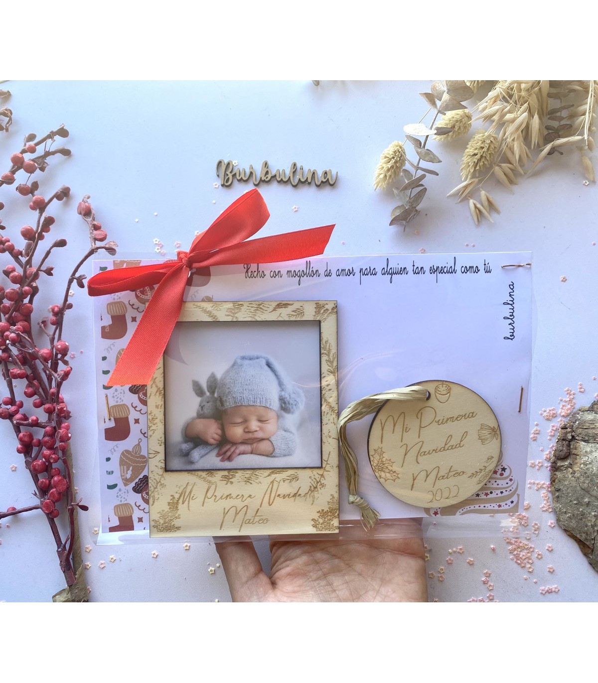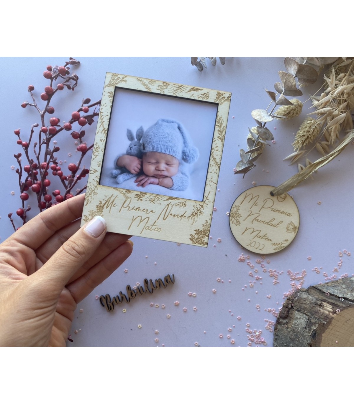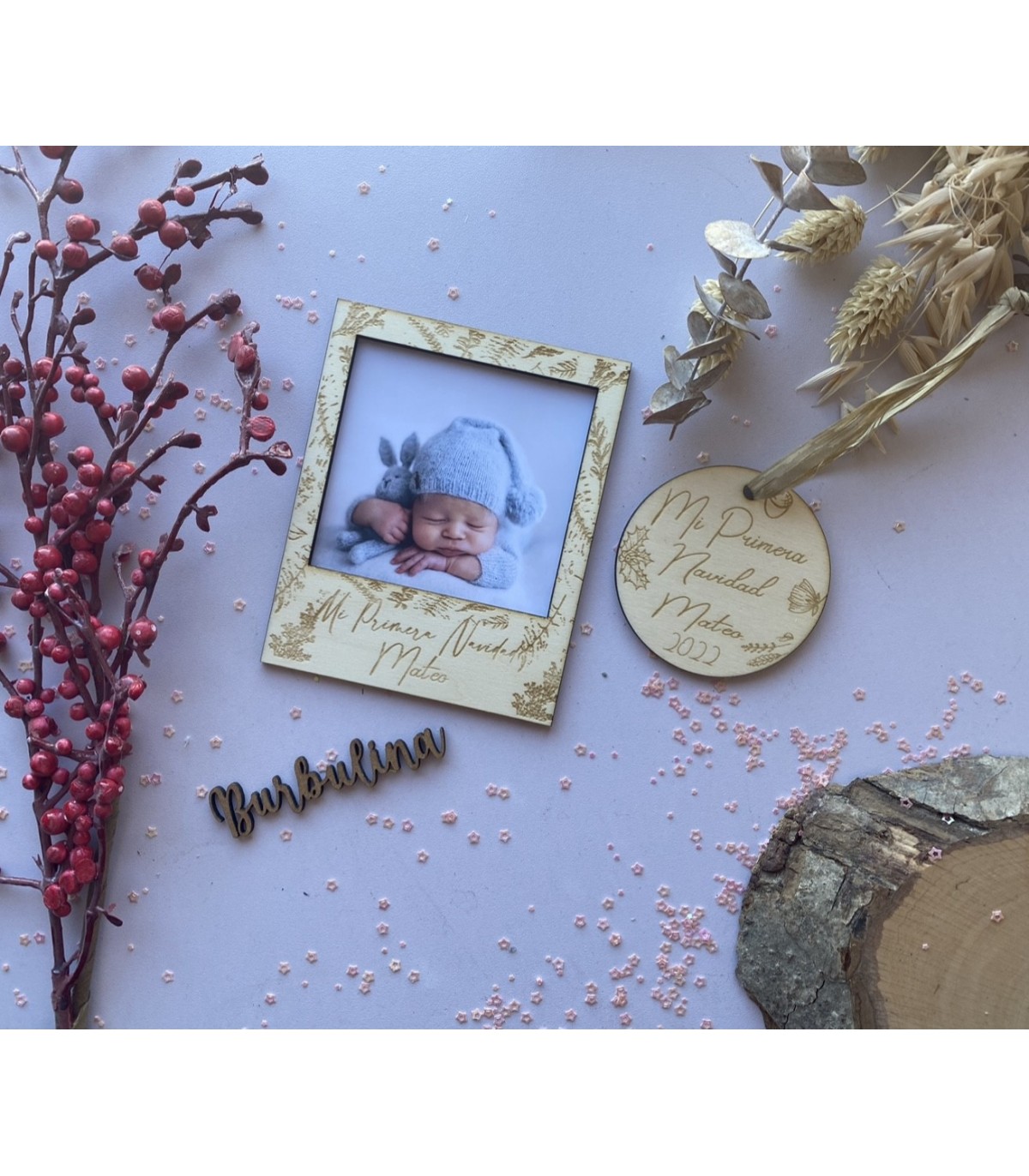 Precioso pack compuesto por marco de madera tipo polaroid con imán y plaquita para el árbol