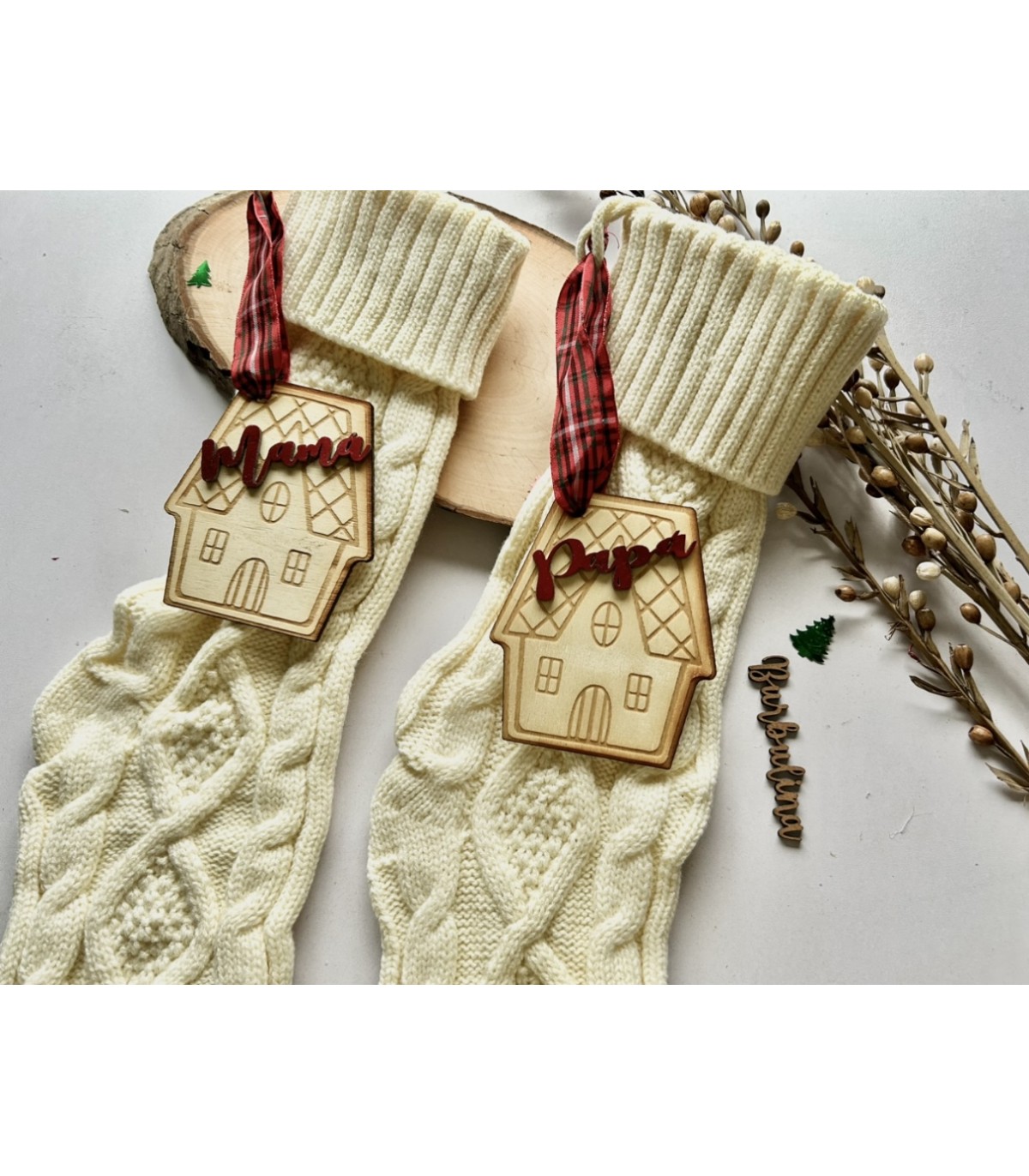 Bota navidad personalizada con nombre en relieve y casita de jenjibre  de madera.