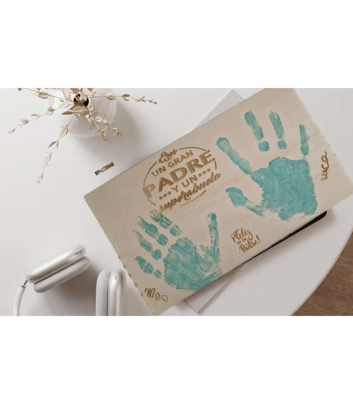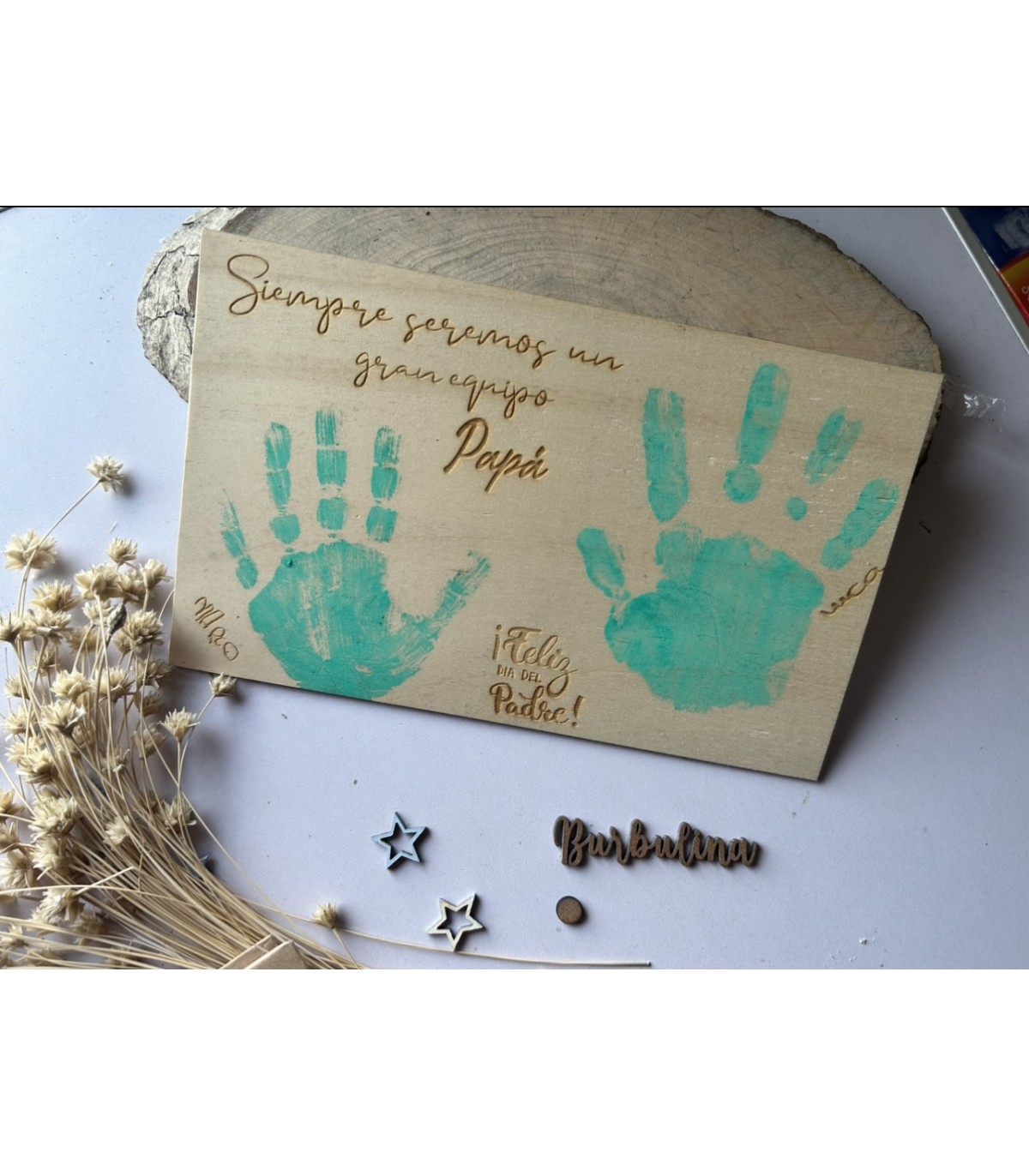 Placa de madera grabada con espacio para las huellas de las manos de uno o dos hijos.