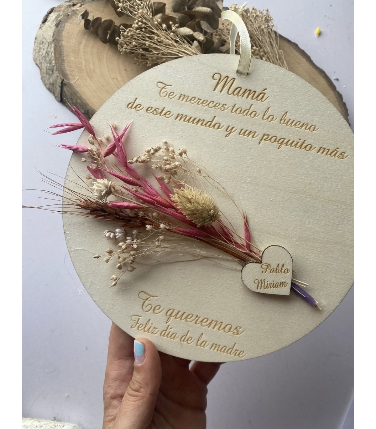 Placas de madera con flores secas y preservadas personalizadas con la frase que quieras. Regalo original para el día de la madre