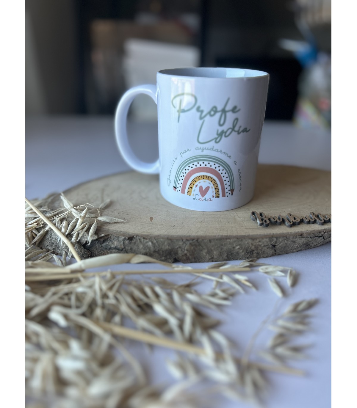Personalizado con nombre de profe y alumno. Diseño de arcoiris en tonos pastel.