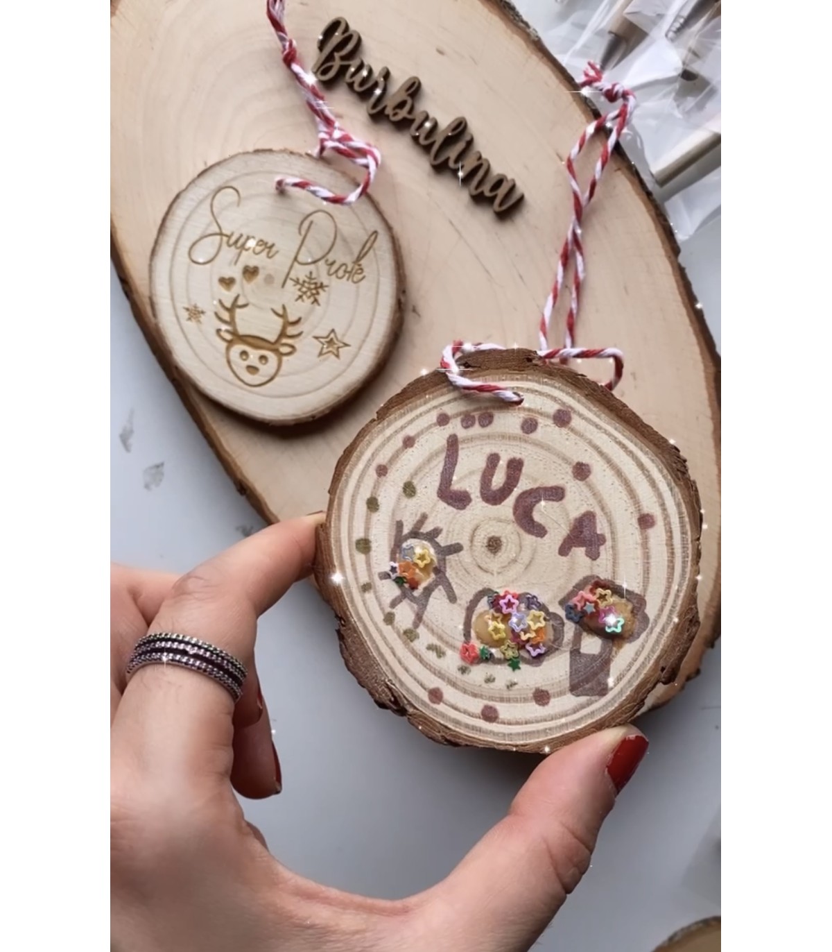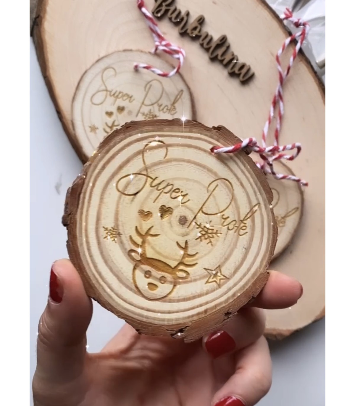 Adorno de madera personalizado por una cara grabada a laser. La opuesta es ideal para que los peques decoren poniendo su sello personal.