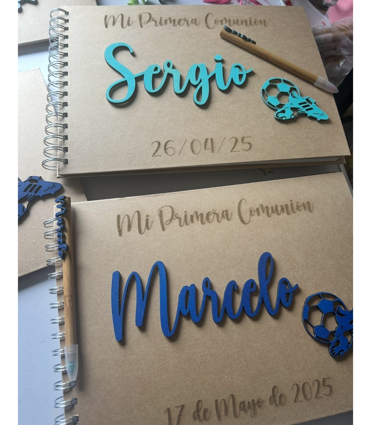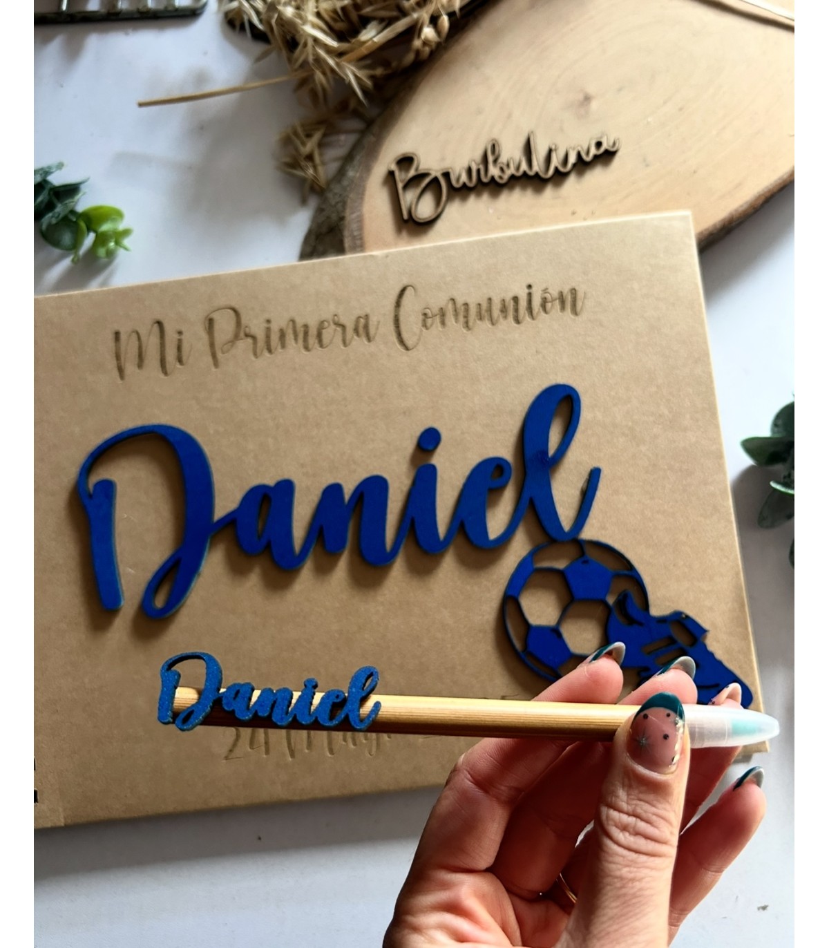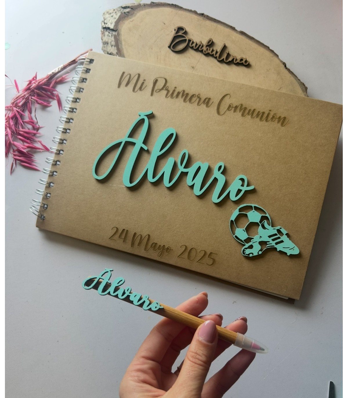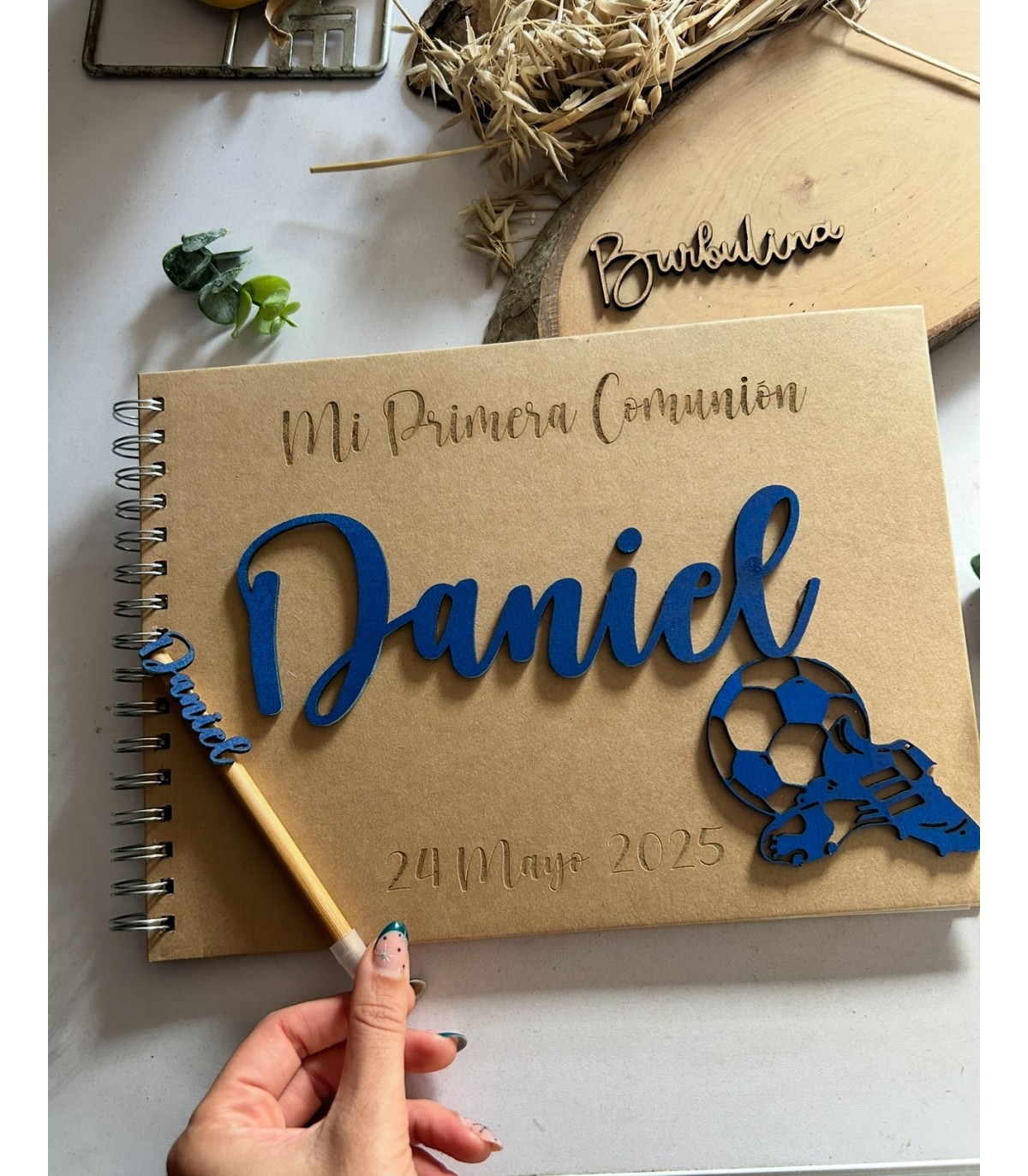 Precioso y elegante libro de firmas con nombre, botas y balón en relieve que se pueden hacer en el color que quieras. Boli a juego incluído